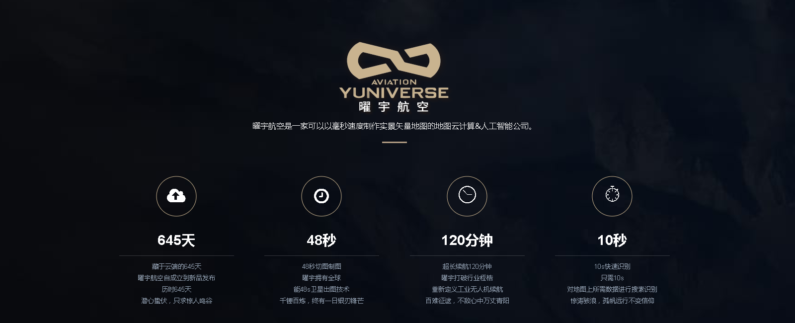 曜宇是中国本土公司,目前在深圳和上海有运营团队和研发中心,核心人员由亿航创始人、NASA(美国宇航局)科学家、美国自然科学基金首席科学家、美国弗吉尼亚探索中心首席科学家、沃尔沃瑞典总部自动驾驶算法科学家、中科大少年班天才等超一流人才组成。曜宇航空是全球第一家也是唯一一家拥有120分钟长航时无人机,并可以以毫秒速度制作实景矢量地图的地图云计算&人工智能公司。相对传统做一张地图需要数天、数周甚至数月的更新时间,曜宇完成了从地图数据的抓取、传输、拼接、纠偏、上传至云端更新最新地图的完整流程,并提高了数百倍效率。
