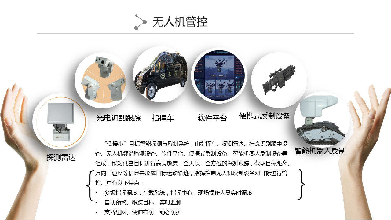无人机探测与管控系统:包括“低慢小”目标智能探测与反制系统平台、雷达探测设备、光电识别跟踪设备、无线电频谱监测。