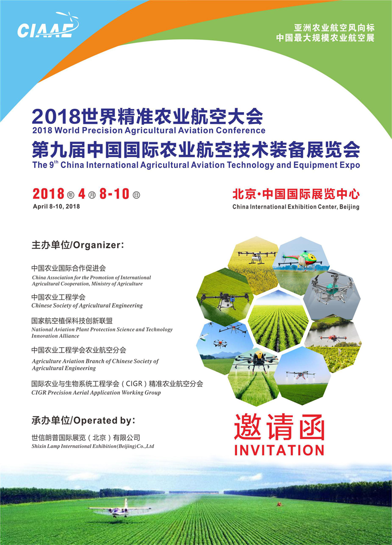 第九届中国国际农业航空技术装备展览会(CIAAE 2018)由中国农业国际合作促进会、中国农业工程学会、国家航空植保科技创新联盟 、中国农业工程学会农业航空分会、国际农业与生物系统工程学会(CIGR)精准农业航空分会联合主办,将于2018年4月8 -10日在北京·中国国际展览中心盛大召开。CIAAE作为国内最具影响力的农业航空盛会,是农业航空新产品、新技术推广的首要理想渠道,同时也是企业与用户交流合作的优质平台。大会同期将举办“2018世界精准农业航空大会”,广泛邀请国际权威专家莅临会场,分享全球发达国家在农业航空领域的最新技术和成果,共谋产业发展和技术、服务创新。