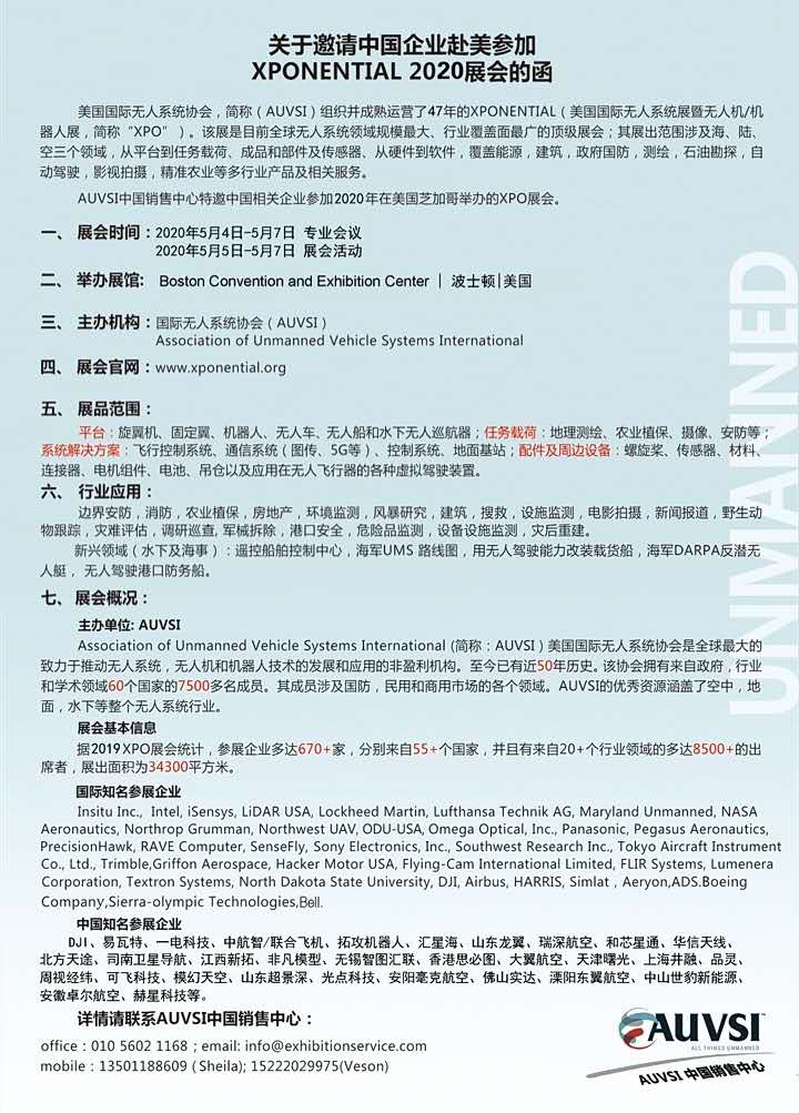 AUVSI中国销售中心特邀中国相关企业参加2020年在美国波士顿举办的XPO展会。