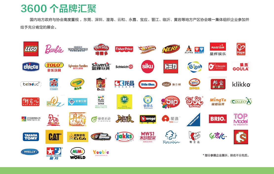 乐高、变形金刚、芭比娃娃、Hape、奥飞、银辉、智高、洪恩、木玩世家、龙昌、伟易达、天衡、育才、凯奇、巧巧、奇特乐、七色花、华森葳。