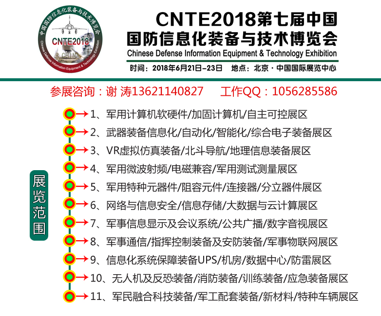 在军队和政府部门的大力支持下,第六届中国国防信息化装备与技术展览会与2017年6月19日-21日在北京中国国际展览中心隆重举行,上届展会吸引了来自中国、美国、德国、法国、比利时、以色列、英国、奥地利、新加坡、俄罗斯、中国香港及台湾等23多个国家和地区的近600多家展商。如:爱普生、中航视画、华三通信、华伟工业、海康威视、星网锐捷、科盾科技、中船重工、德馨同创、曼恒数字、青瞳视觉、国科天迅、李龚导航、神基电通、国科环宇、华测导航、艾普斯、泰琪科技、矩形科技、量子防务、台电实业、达威思、华会通、天誉创高、博信宏达、迈普通信、邦彦技术、天珩通、申瓯通信、海能达、英特力、米波通信、湖南优加、军友信息、浙江席媒、中孚信息、宇達資訊、安点科技、卫达科技、军懋国兴、中船信息、中交通信、紫瑞青云、易讯通、芯盾信息、华澜微、中铁信安、立思辰、图雅丽、朝阳电源、永贵科技、航天电器、航天二院二部、航天七〇二所、苏试试验、神州普惠、艾瑞斯通、科华恒盛、众创中原、科士达、志成冠军、德力仪器、福建福光、新益技术、通茂电子、创远仪器、新维电信、赛四达、达迪通信、安徽创世、数码视讯、中电40所、键特电子、宜鼎芯存、威固信息、安密电子、中安网脉、华云数据、锐凌光电、迈锐光电、洲明科技、七维测控、航天图景、南海合历、上海哈登等知名企业。展览涉及军用计算机软件/硬件、加固计算机及嵌入式、军用自主可控软硬件、网络与信息安全、信息存储、大数据与云计算、武器装备信息化、核心电子元器件、微波射频、电磁兼容及测量仪器、北斗导航、VR虚拟仿真、信息显示终端、会议系统、数字音视、军事通信、指挥控制装备、军事安防、物联网、无人机、军民融合科技装备、军工配套装备、新材料、特种车辆及方舱设备等几十个专业,涵盖了民营企业参与信息化建设的主要领域。