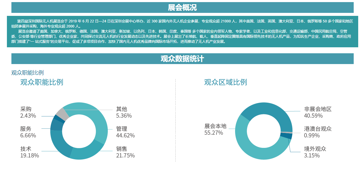 第四届深圳国际无人机展览会于 2019 年 6 月 22 日—24 日在深圳会展中心举办,近 300 家国内外无人机企业参展,专业观众超 21000 人,其中美国、法国、英国、澳大利亚、日本、俄罗斯等 50 多个国家和地区组团参展并采购,海外专业观众超 2000 人。