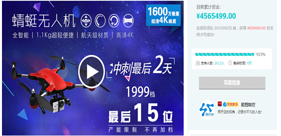 星图蜻蜓无人机完成了在淘宝众筹平台上为期45天的众筹,据官方提供的数据,众筹金额达4565499元,无人机产品众筹达2012台。蜻蜓在2天时间突破100万大关,8天时间更是直接冲破200万大关!在国内无人机众筹类目中,金额和数量均是第一。这到底是一款怎样的产品,如此吸引大家的关注与好奇?