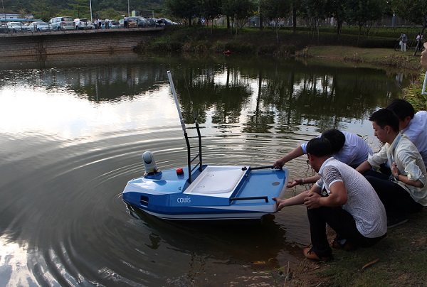 测量,更有全自动的水面清洁机器人,自动打窝探鱼机器人和多功能水上机器人。 比如本次展出的C400水上智能船、C180型水上测绘机器人、C100型水上测绘机器人3款新产品,完全是自有知识产权技术,从复合材料、推进器到传感设备均是自主研发,特别是船体的复合材料采用了国内最新技术,轻型、防撞、耐蚀性能处于领先水平,这极大提升了无人船的综合性能。其中,新研制的C400型智能无人船,是以近海、港湾、湖泊、河流、水库等大水域为对象,自主执行多任务系统的水上机器人平台。该平台由
