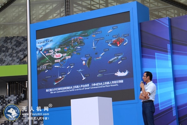 技术总监朱宏磊为现场来宾做了水上机器人主题演讲。分为产品系列介绍、企业介绍及对未来市场空间的展望。无人