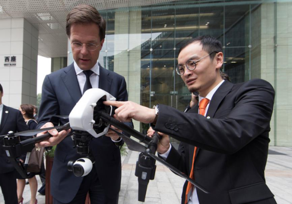 大疆创新创始人兼CEO汪滔向吕特首相介绍大疆“悟(Inspire 1)”无人机