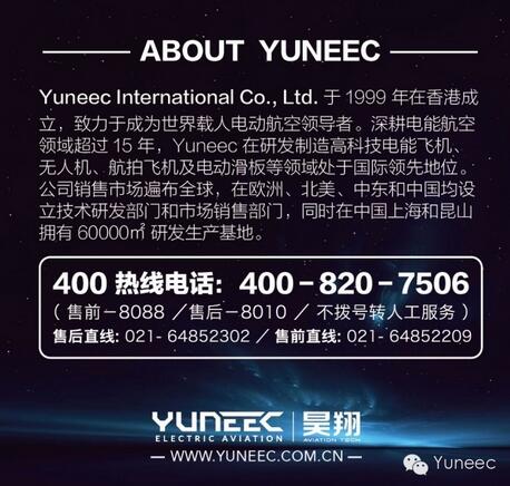 载人飞机适航证。飞速前进至2015,YUNEEC已在北美、欧洲和亚洲设立分部,成为一个全球性的企业。每年为其它品牌生产一百多万组产品以及自产自销的台风和旋风系列。