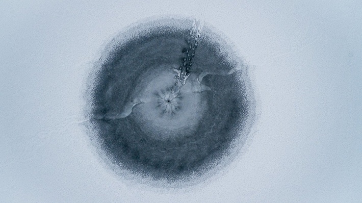 2、这是冰湖上钻出的一个钓鱼孔,位于