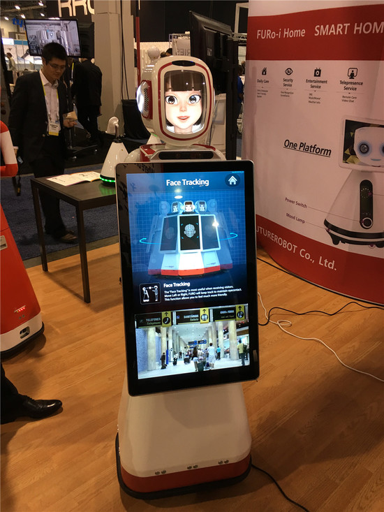 韩国FutureRobot公司推出服务机器人FURo-D。这台机器人支持韩语、英语、中文以及日语四种语言, 可以实现票据打印、让机器人跳舞、人脸识别、照片打印等功能。