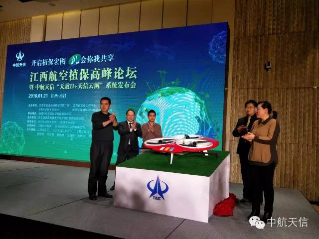 中航天信于2016年1月21日在江西南昌绿地华邑酒店举行江西航空植保高峰论坛暨中航天信“天敌II+天信云网”无人机植保系统发布会,特邀江西省农业厅、工信委有关领导,北航、中国农大等科研机构,合作伙伴、渠道伙伴和合作社、种粮大户等用户,以及媒体的朋友共聚一堂,探讨江西省无人机植保产业的管理创新和技术发展,凝聚产业智慧、探索发展途径。在此论坛上,中航天信提出了全新的无人机农业植保业务模式,发布了农业植保专用机型——“天敌II”和相应的数据运控管理云平台——“天信云网”,力求全面推进无人机农业植保机械化、自动化、产业化、现代化发展。