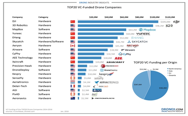 处于创业阶段无人机公司已经受到了一些世界顶级的工业公司(例如高通、英特尔、通用电气、波音公司)的关注,获得了他们的投资资金。风投公司和国际公司争相在有吸引力的初创公司投资,让无人机行业升温加速。