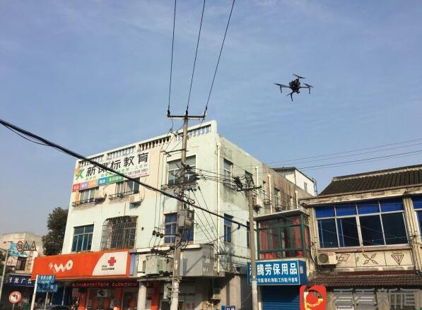 工作人员熟练地操作无人机起飞,并控制飞机在一栋自建三层楼房上盘旋巡视。