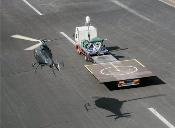 近日,在英国威尔士,一架无人驾驶的SW-4直升机慢慢飞近公路上的一辆拖挂卡车,这辆卡车后面拖带的并不是集装箱和货物,而是一块画有直升机起降标线的钢板,以模仿海上舰艇的直升机飞行甲板。这是英国战术海上无人空中系统(TMUAS)项目的首次演示飞行。