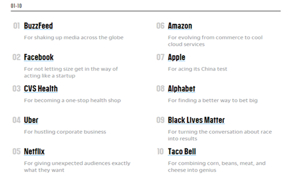 在“2016全球最佳创新公司前50”榜单中,美国新闻聚合网站BuzzFeed作为“媒体行业的颠覆者”位列第一;Facebook因“始终保持着初创企业的活力”位列第二;CVS Health作为“和互联网紧密结合的创新医药公司”紧随其后;Uber、Netflix、亚马逊、苹果、Alphabet、Black Lives Matter和Taco Bell分别位居榜单第四至第十名。