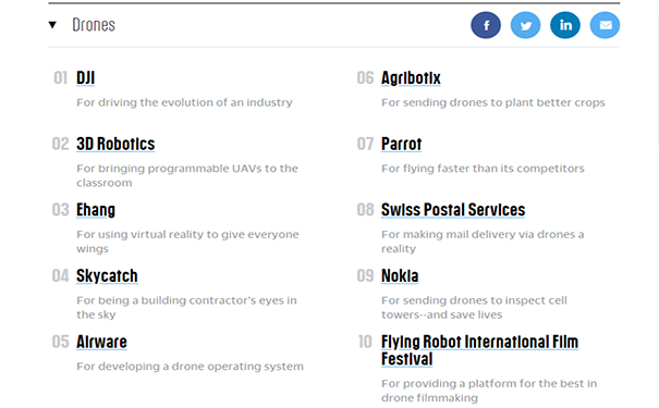 3D Robotics因“将可编程无人机带到了课堂”位居第二;Skycatch因“成为了建筑承包商们的空中之眼”位居第四;Airware则因“发明了无人机操作系统”排第五位。Agribotix、parrot、Swiss Postal Services、诺基亚、Flying Robot International Film Festival分别排在第六至第十名。