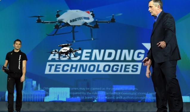 图:英特尔CEO科再奇在去年CES上展示Ascending Technologies的无人机