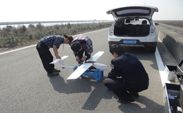 本次飞行的无人机为“Deserthawk——沙漠鹰智能电动无人机”。航摄现场,Deserthawk根据预先设定的飞行航道,飞到指定海域上空,获取用海项目相关高分辨率遥感影像,同时通过单频GPS记录下传感器曝光时刻的定位信息,用于事后影像数据分析。由于需要测量的用海面积较大,受电池续航能力影响,Deserthawk需要分6个航次(预计2天时间)来完成此项任务。