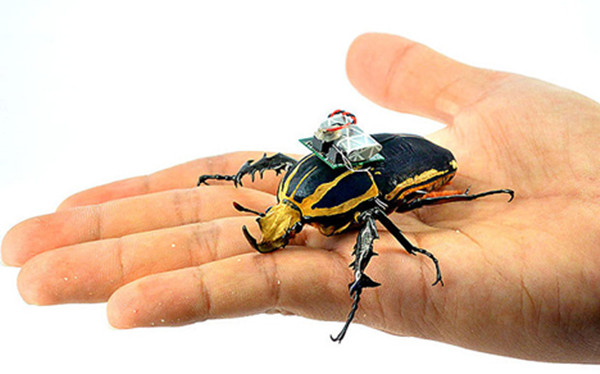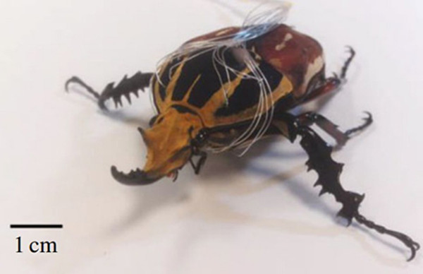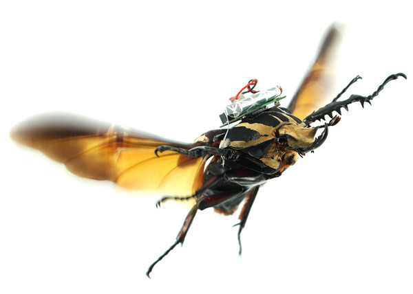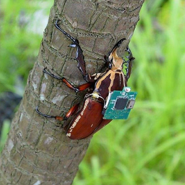 它们相信这项发明能够取代市面上的一些无人机,并且甲虫通过训练会变得更加敏捷,甚至可以不需要工程控制。他们将电极固定在甲虫腿、视叶、飞行肌肉这样的特殊部位,通过无线电信号的触发,即可远程控制甲虫走特定的路线、起飞、悬浮在空中、向左右转弯。这些电极与配有处理器和电池的微型芯片相连接,使用有机蜜蜡「粘」在甲虫的背上。