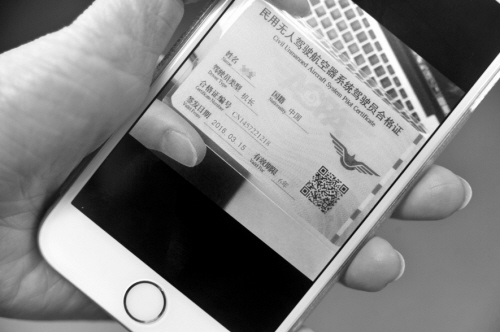 昨日,熟知此事的孙女士向记者展示了手机中的照片,上面有一张驾驶证大小的证件,其上写着“民用无人驾驶航空器系统驾驶员合格证”,姓名、国籍、驾驶员类型、合格证编号等信息,右侧有一个二维码。孙女士笑着说:“你只要在微信里识别这个二维码,再填上自己的名字,就能生成一个写着你名字的证件照。”