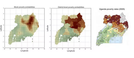 左图:基于10km*10km的细粒地图网格数据的贫困概率预测;中图:基于区域级别的贫困概率预测;右图:2005年的真实普查结果对比