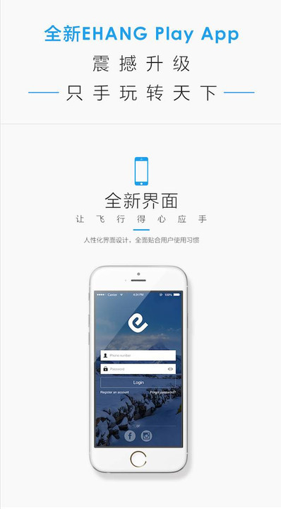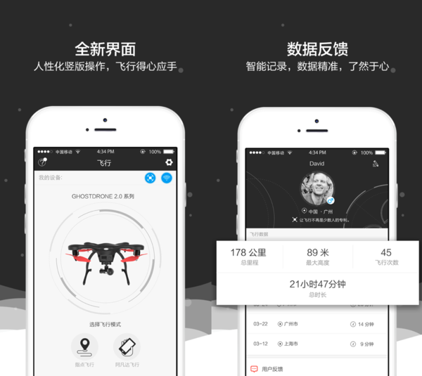 作为人机交互的连接,全新改版的EHANG Play APP提供了一个更加友好的用户界面,结合飞控、软件指引、新手教学合理引导新手用户安全操作及智能手机、无人机、G-Box/VR眼镜的连接过程。新增用户账号功能,与官网用户信息进行同步,并增加飞行记录模块,精确记录每次飞行里程、高度、时长、地点、飞行次数等数据。