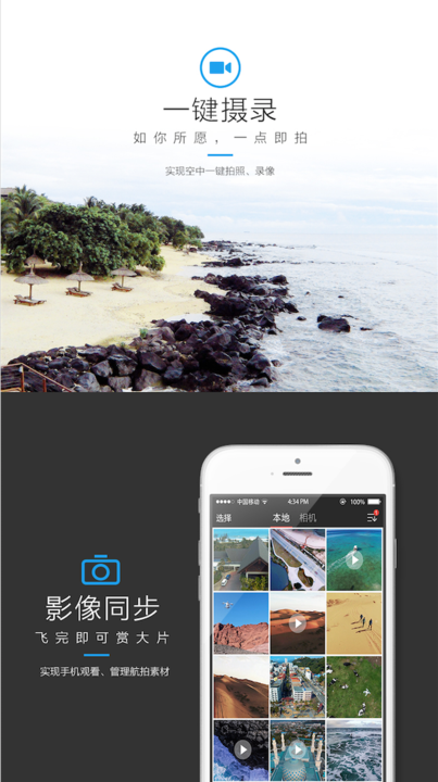 配合球形相机,全新升级的APP可以在飞行的过程中实现一键拍照、录像、暂停等功能。通过手机Wi-Fi连接球型相机,即可将压缩后的航拍视频和图片回传、保存到手机端查看,便于及时分享。
