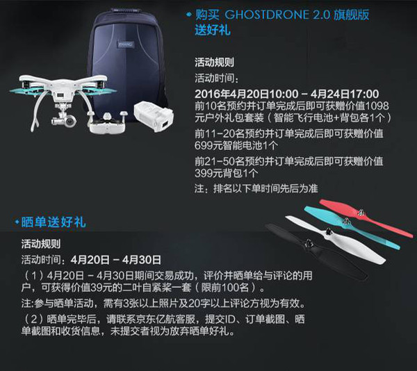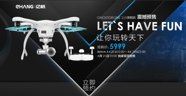 升级改版后的亿航GHOSTDRONE2.0系列提供云台版、旗舰版2个套装。云台版配备亿航方形运动相机和G-BOX,旗舰版配备4K球形相机和VR眼镜。4月20日在京东开启独家预售,4月25日在京东首发,价格分别3499元(云台版)、5999元(旗舰版)。