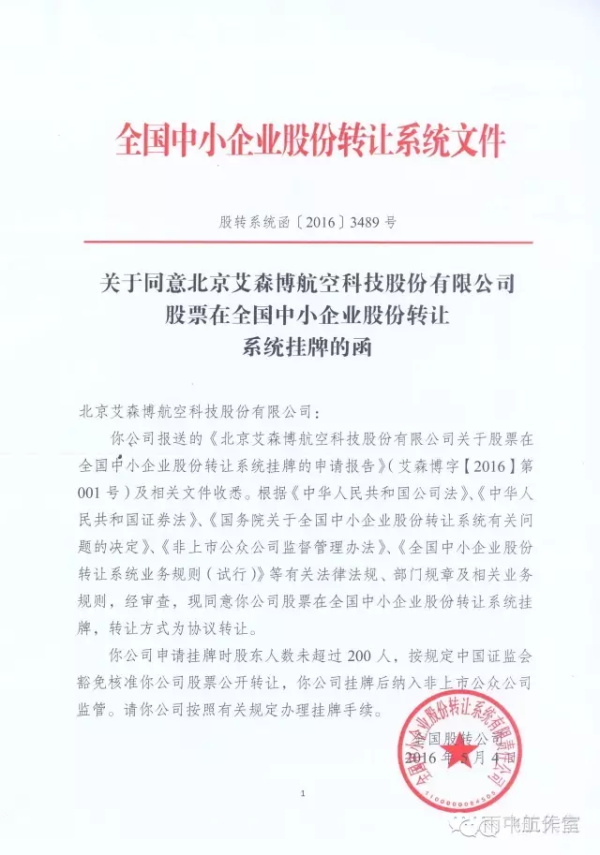 2016年5月30日,北京艾森博航空科技股份有限公司和四川特飞科技股份有限公司分别通过了全国中小企业股份转让系统的审核,在新三板正式挂牌,成为又一批成功挂牌新三板市场的民用无人机企业。