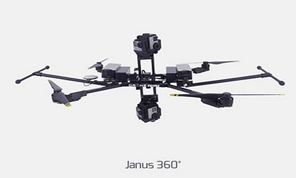 Janus 360是一架无人直升机,上方和下方各设一组Freedom 360支架,每组可放置5部GoPro相机,整架无人机可搭载10部GoPro相机。它能够在空中进行360°拍摄,而相机的三脚架、无人机的螺旋桨或起落架等支撑物都不会出现在视频或图像中。Janus360至少可飞行15分钟。