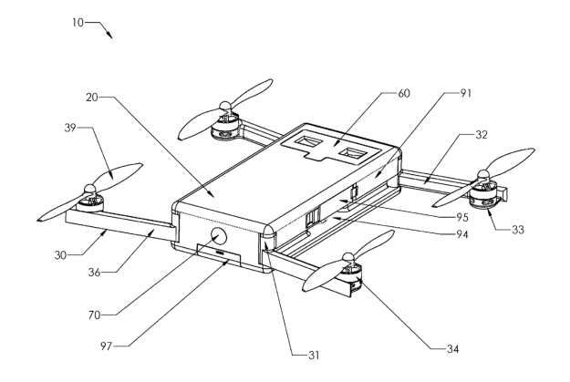 该专利详细介绍了这个盒子的名字“QuadBox”,它是一个带可折叠支柱和螺旋桨的方形盒子。不出意料的是,它的顶端有一个GoPro专用的挂载口。该专利的示意图中使用的是一个矩形机身,但它也可以选择使用球形或是圆柱形的机身。