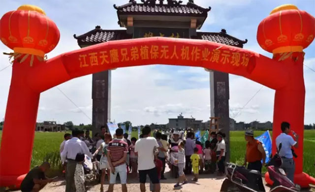 6月28日在抚州市临川区农业示范基地里,5架来自江西天鹰兄弟的植保无人机只用1分钟,就完成了十亩农田的施药,这是临川区首次采用植保无人机进入田管领域喷洒农药。