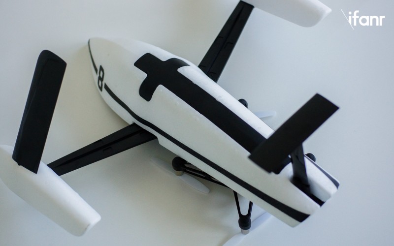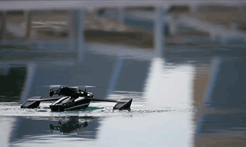 引擎发动后无人机将会垂立于水翼艇上,为船体提供动力,并且可以轻松转向,依托左右两侧的辅助设计,使船身不会倾覆。