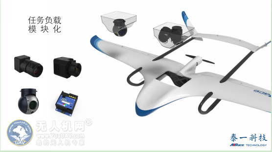 在不同的使用环境中有不同的任务系统,模块化的机翼设计,可便捷的更换成不同尺寸,且在同一飞控系统中完成自动校准,使得我们可任意切换高速模式或者长航时模式。动力模块同样可以在高原版、大推力版、长航时版和教练机版之间根据载荷要求随时拔插切换,满足用户的多种用途。