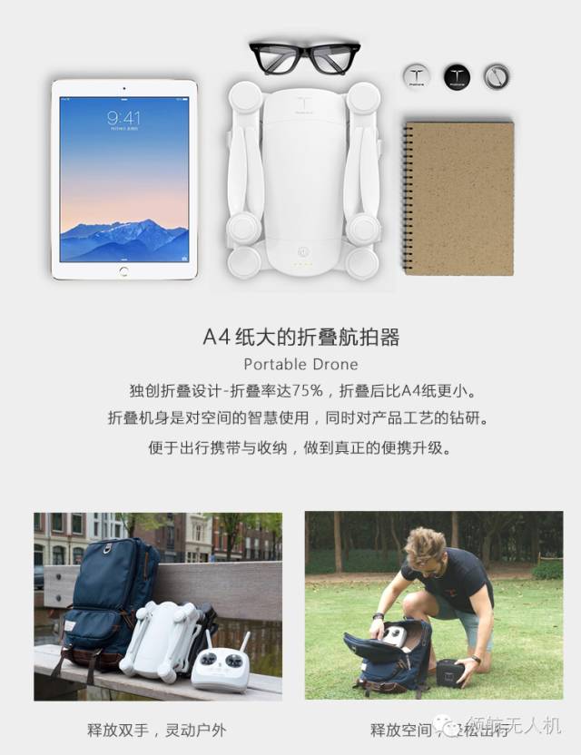 秉持全折叠的设计理念, 创造性地把性能强悍的飞行器变形到面积仅有iPad大小,厚度仅有10厘米的极致外形,轻便易携,尽享户外。