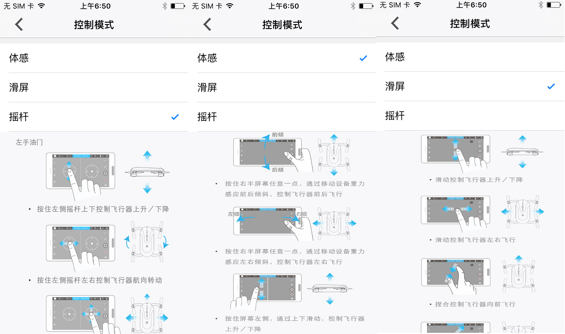 具体的操控上,DOBBY 无人机支持划屏操作和体感控制,近期又加入了虚拟摇杆控制,方便专业玩家上手。划屏操作是用手机在屏幕上下左右滑动控制飞行姿态,上升下降、前进后退,调整机头正对的方向,确切的说是相机拍摄的方向。体感控制则允许你前后左右摇晃手机进行操作,类似于《狂野飙车》、《真实赛车》等竞速类游戏。为飞行器和花花草草的安全着想,DOBBY 把手机姿态控制的最大角度限定在了 45°,也就是说手机倾角超过 45° 后中止操控。