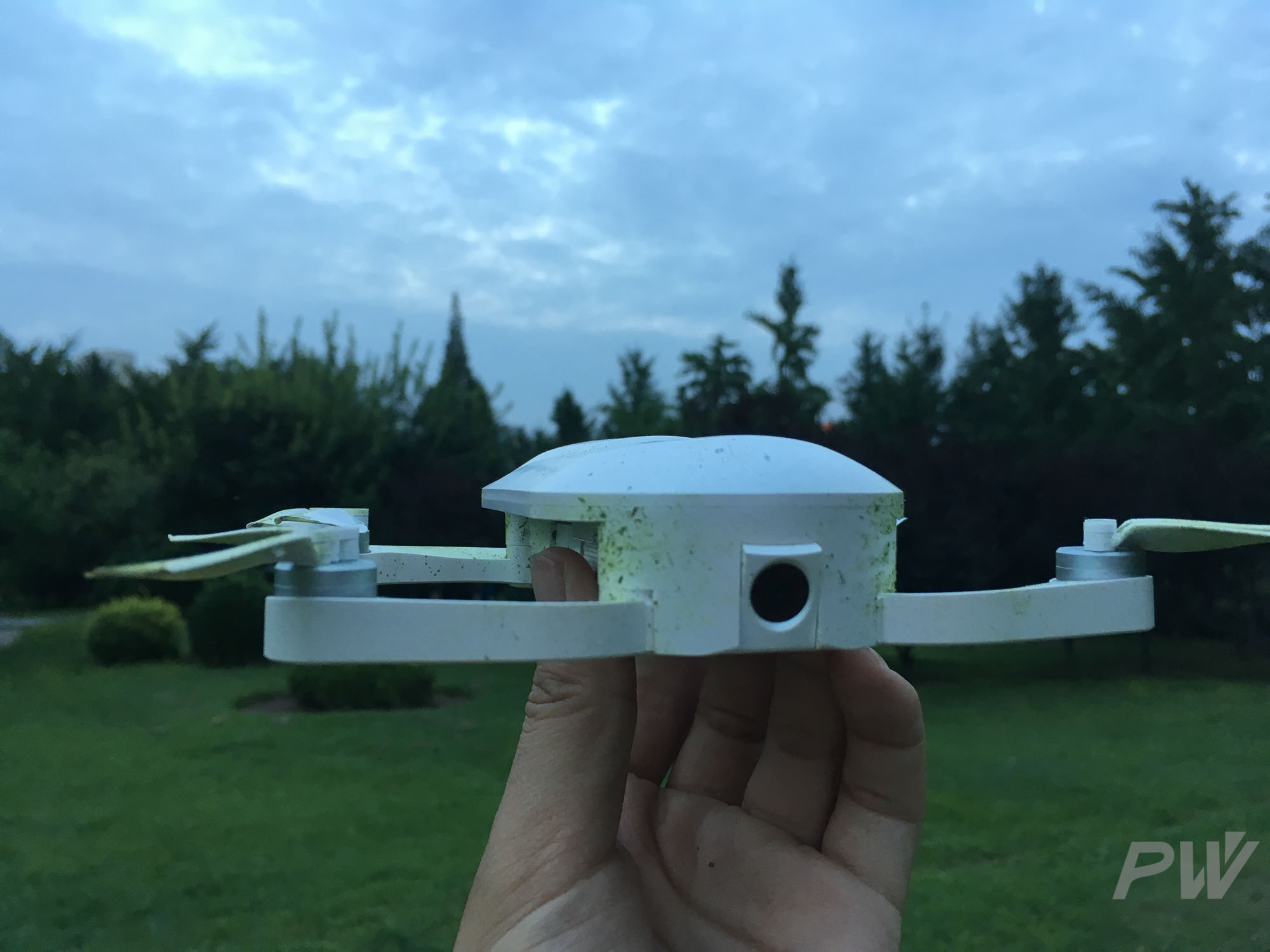 掌上降落是 DOBBY 重点宣传的另一项功能。它通过底部的摄像头识别手掌的形状,进而实现掌上降落。不过劝你别没事儿拿出来炫耀,等你被旋翼打中的时候肉疼是少不了的。零度智控表示,考虑到安全性,DOBBY 无人机在接触到障碍物时,螺旋桨回停止转动,避免造成不必要的伤害。我在试飞的时候就遇到过撞向玻璃门的情况,一米多的高度,捡起来继续飞行。在树丛中飞行它就比较固执了,执意要自己开辟出一条道路,挣扎着出来后就成了下面这个样子,都绿了……