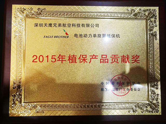 植保产品贡献奖是一年一度植保行业的权威评奖活动,是对服务于三农事业的企业和个人辛勤付出的肯定,得到全国各级农技推广部门、农化企业、植保从业人员的广泛关注;2015年植保产品贡献奖”评选活动经过严格核查、专家评审、社会公示,天鹰兄弟电池动力单旋翼植保机获得了此项殊荣。