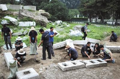 历经沧桑后,游客在远瀛观遗址处只能看到一些汉白玉雕花石柱和散落的石构件。考古工作自今年6月启动,持续到11月底,这期间考古人员要在800平米的遗址内发掘散落地下的文物,了解这里的建筑工艺和结构,为下一步的抢险工作提供方案。