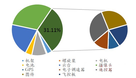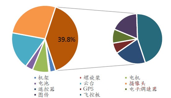 芯片功能高度集成直接的影响是为无人机节省多个高价格的功能部件,包括飞控板、图传模块、信号传输模块、GPS 导航、电子调动模块等等。根据玩家DIY 所使用的各个配件成本来计算,这些部件合计占开源飞控的无人机成本近40%(使用APM 等中等价位的飞控板),占非开源飞控的无人机成本30%以上(大疆使用自主开发及生产的Naza飞控板,价位偏高)。