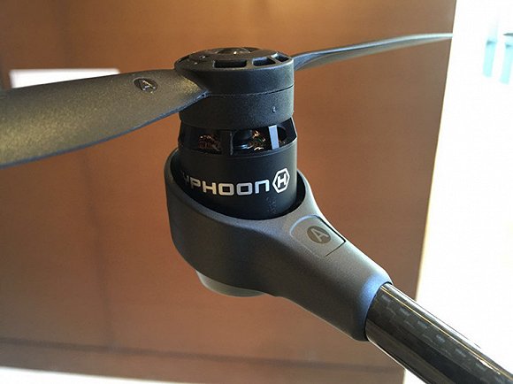 起落架可收放,台风HRS的六个旋翼支臂均采用可以折叠设计,按压开关即可收放。旋翼支臂使用了碳纤维材质,这在减轻机身重量与耐磨损方面有了一定改进。整体机身的碳黑设计,给产品增色不少。