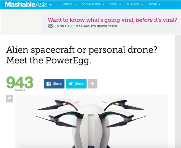 《外星人飞行器还是无人机?》,社交媒体知名新闻网站Mashable的报道则从PowerEgg特立独行的蛋形外观入手,记者在体验了PowerEgg的拍摄后对其摄像功能和清晰度也予以了高度评价。