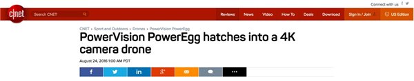 CNET(科技资讯网)发布了一篇关于PowerEgg航拍功能的新闻,在标题中直指臻迪PowerEgg搭配4k相机,航拍性能优越。记者描述道:“机器人公司PowerVision的这款无人机设计很人性。当机器关闭时,它看起来像一个闪闪发光的白色鸡蛋。只要按下开关键,螺旋桨和支架就会弹出,准备起飞“。
