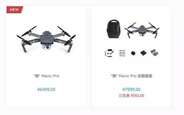 目前“御” Mavic Pro 官网售价 6499 元,电池价格为 499 元。同时推出的全能套装包括 Mavic Pro,额外两块电池、单肩包、两根备用螺旋桨、,充电管家、车充,以及电池充电宝转换器,售价为 7999 元。