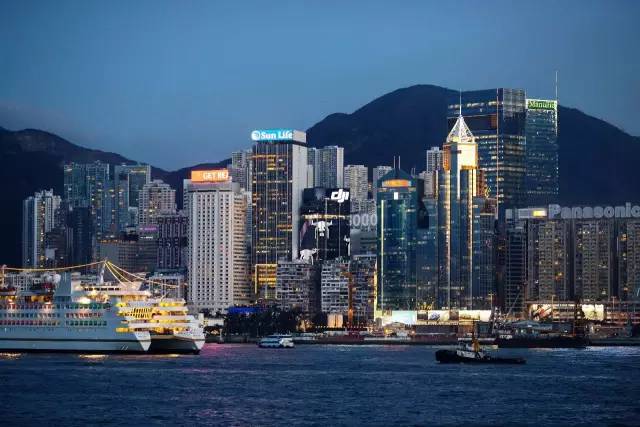 从维多利亚港对面看到的DJI logo及无人机动感影像