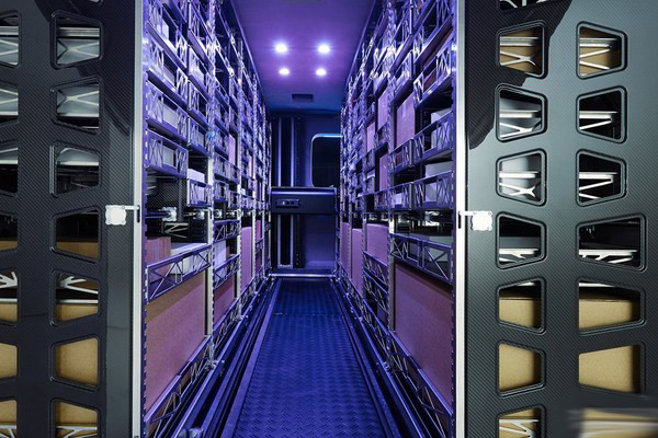 概念车配有一套先进的装货系统,车厢内已经被隔成N个小隔间,简直就是为快递量身定制。另外,还有专用的货架传送车,一切都为提高装车、运输效率服务。