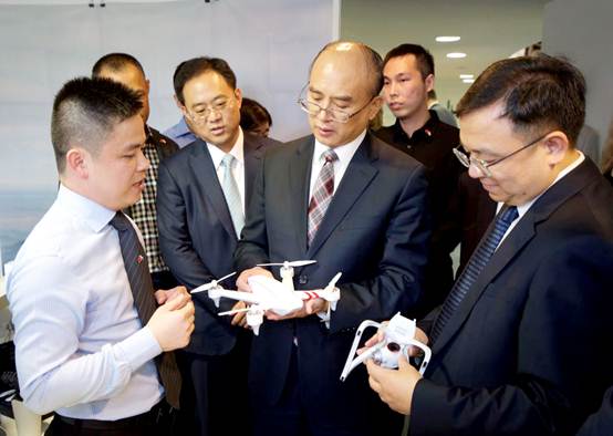 图为疆域智能CEO陈思达(左一)向深圳市市长许勤(右三)展示Hornet S大黄蜂无人机