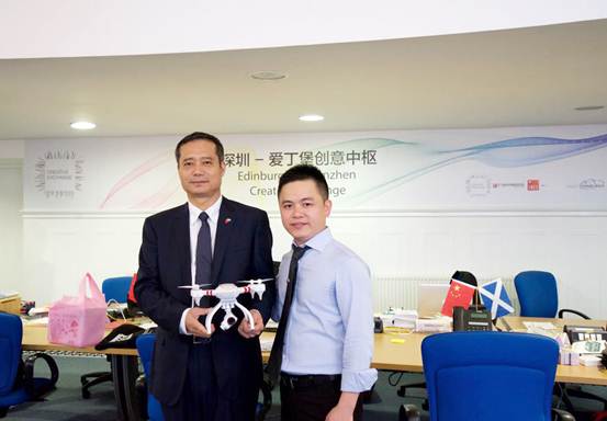 疆域智能CEO陈思达与Hornet S大黄蜂在英国爱丁堡创意中枢合影