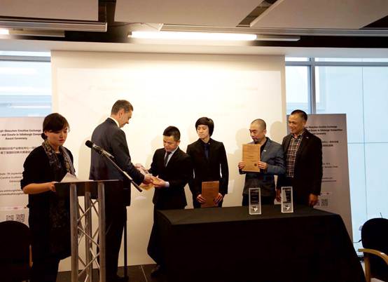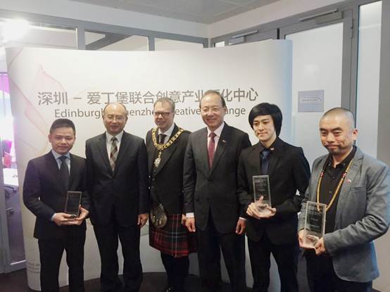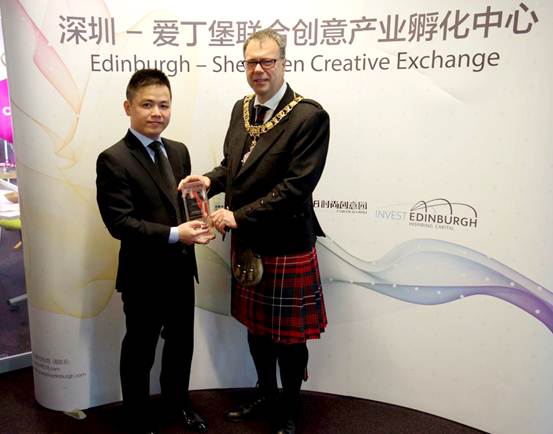 图为爱丁堡市政厅企业创新处处长Jim Galloway(左二)向创·爱丁堡国际创新大赛获奖企业深圳市前海疆域智能科技股份有限公司CEO陈思达(左三)颁奖
