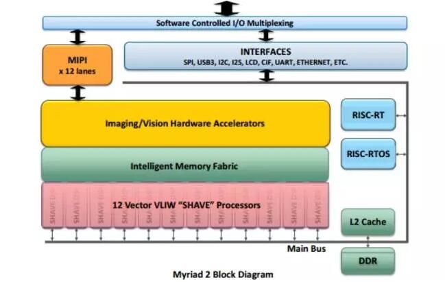 从上图可以看出这款处理器主要由SPARC处理器作为主控制器,加上专门的DSP处理器和硬件加速电路來处理专门的视觉和图像信号。这是一款以DSP架构为基础的视觉处理器,在视觉相关的应用领域有极高的能耗比,可以将视觉计算普及到几乎所有的嵌入式系统中。Movidius曾经发布过一款指上型深度学习计算板,显然它的架构也很适合用来做深度学习的计算。而最近已经曝光的微软Hololens当中的HPU全息处理器也是基于Tensillica的DSP内核,擅长于多媒体应用的DSP在视觉领域的威力依然强大。让我们脑补一下,如果将图中的SPARC RISC处理器替换成X86处理器,那就是Intel完全自主的视觉处理器了。